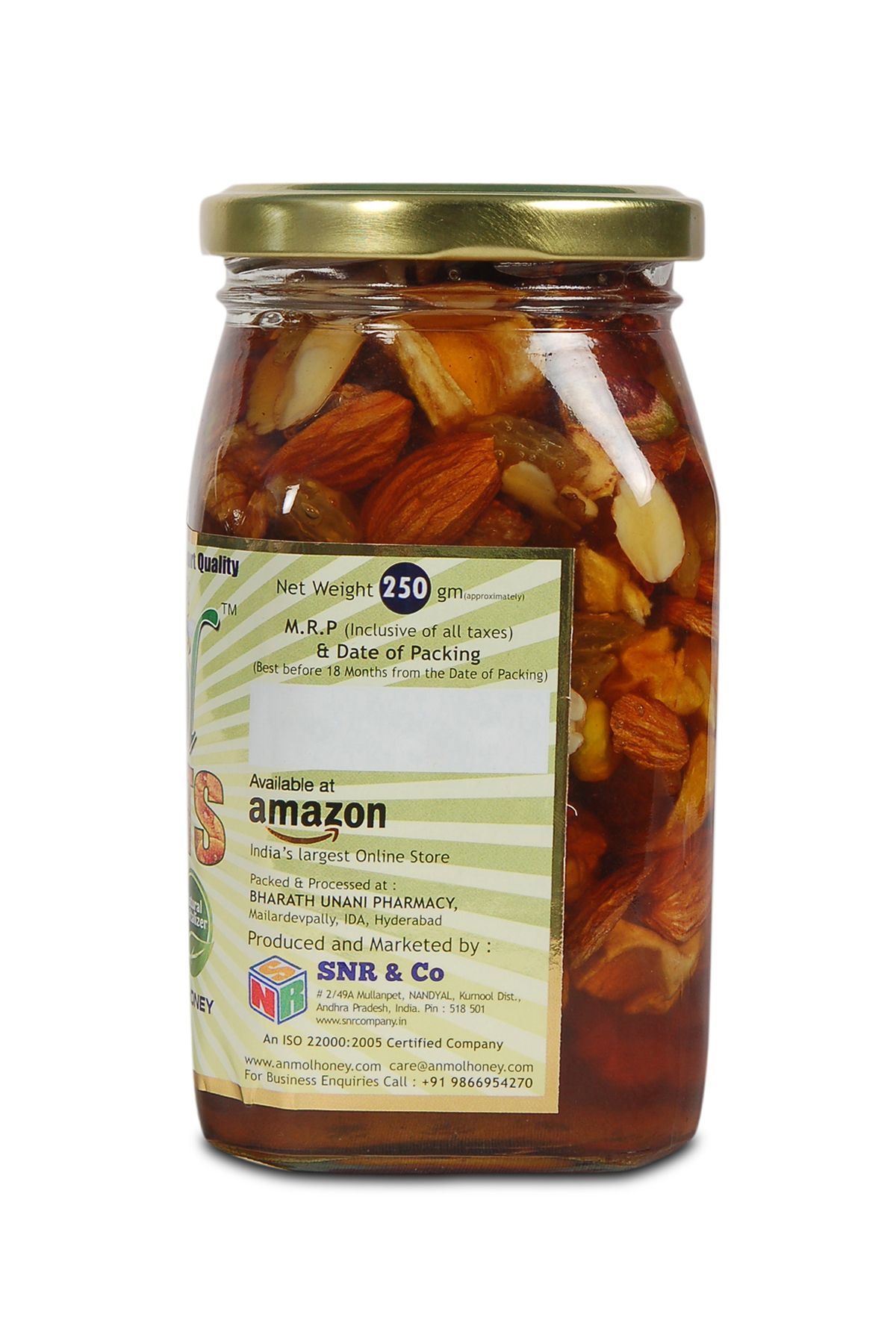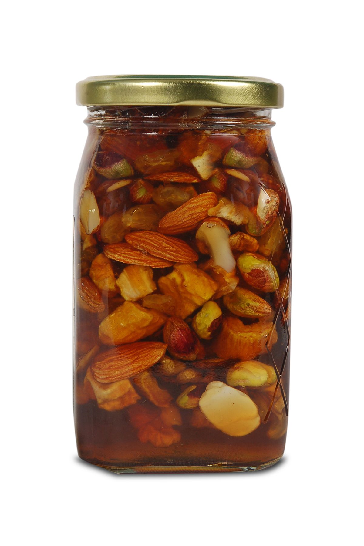 Superior quality Dry Fruits with 100% Pure & Natural Honey. It contains equal quantities of Almonds, Pistachios, Walnuts, Dried Dates,Dried Figs & Golden Raisins in Natural Honey base.