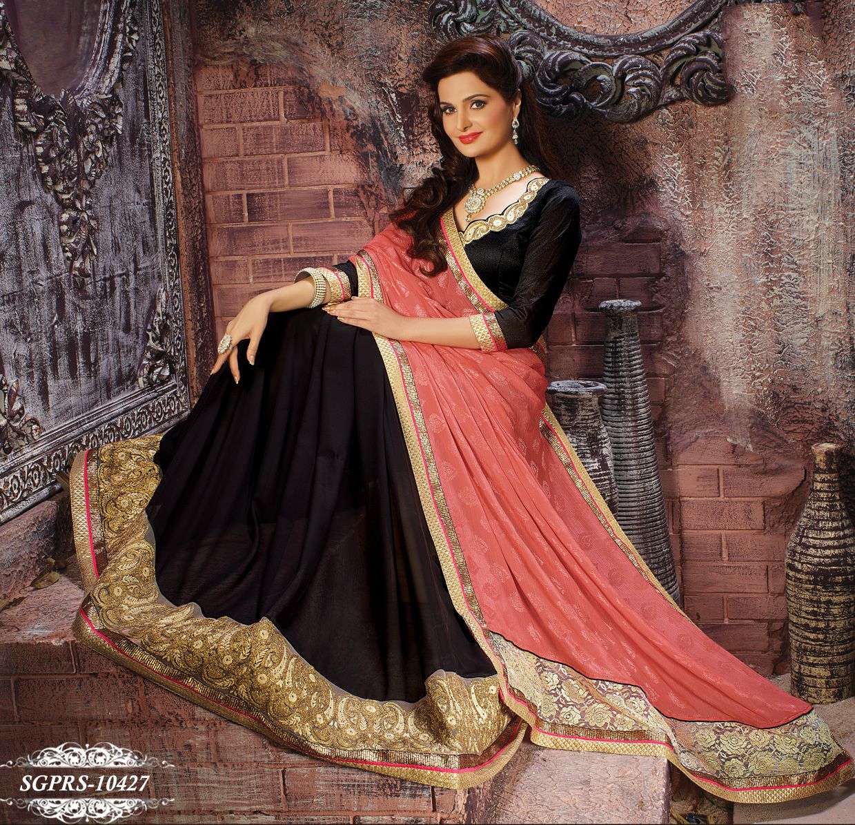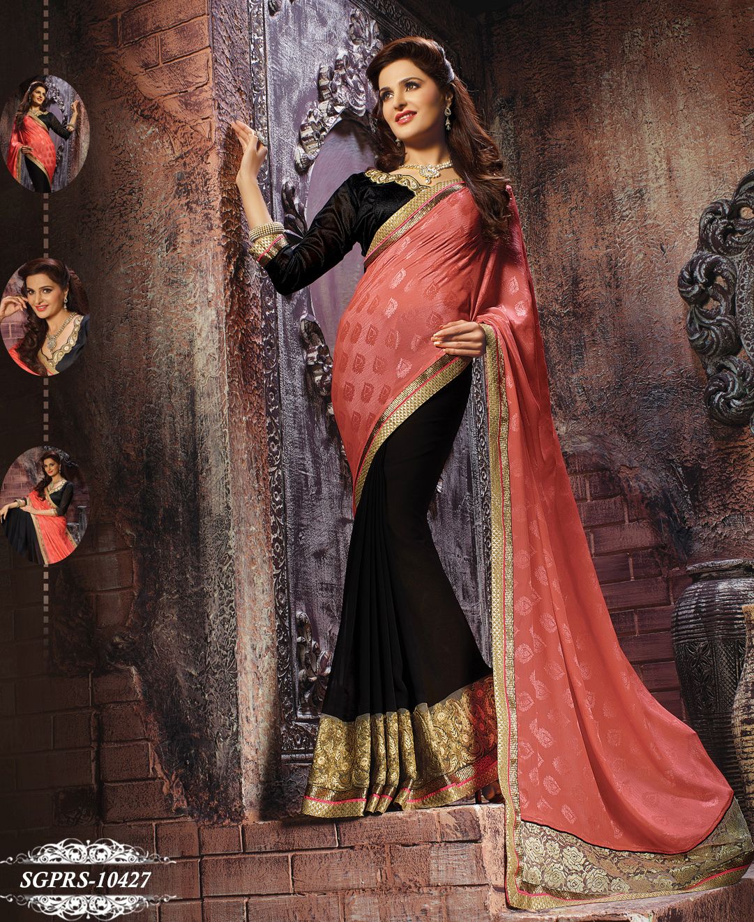 Shonaya Pink & Black Colour Georgette Embroidered Saree With Blouse Piece