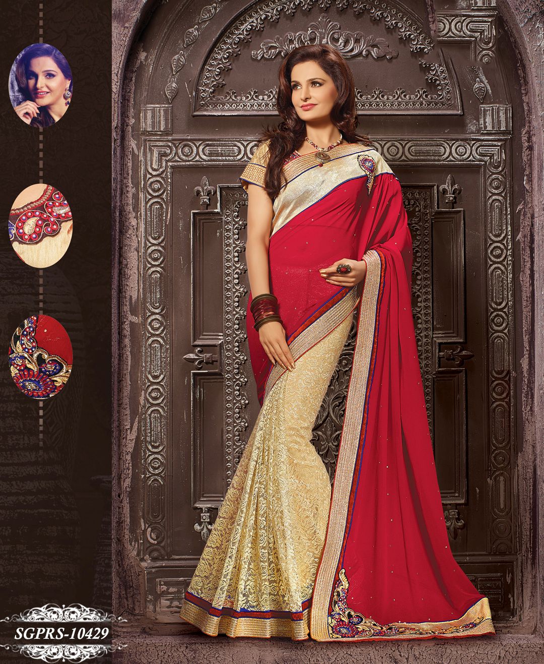 Shonaya Red & Beige Colour Georgette Embroidered Saree With Blouse Piece